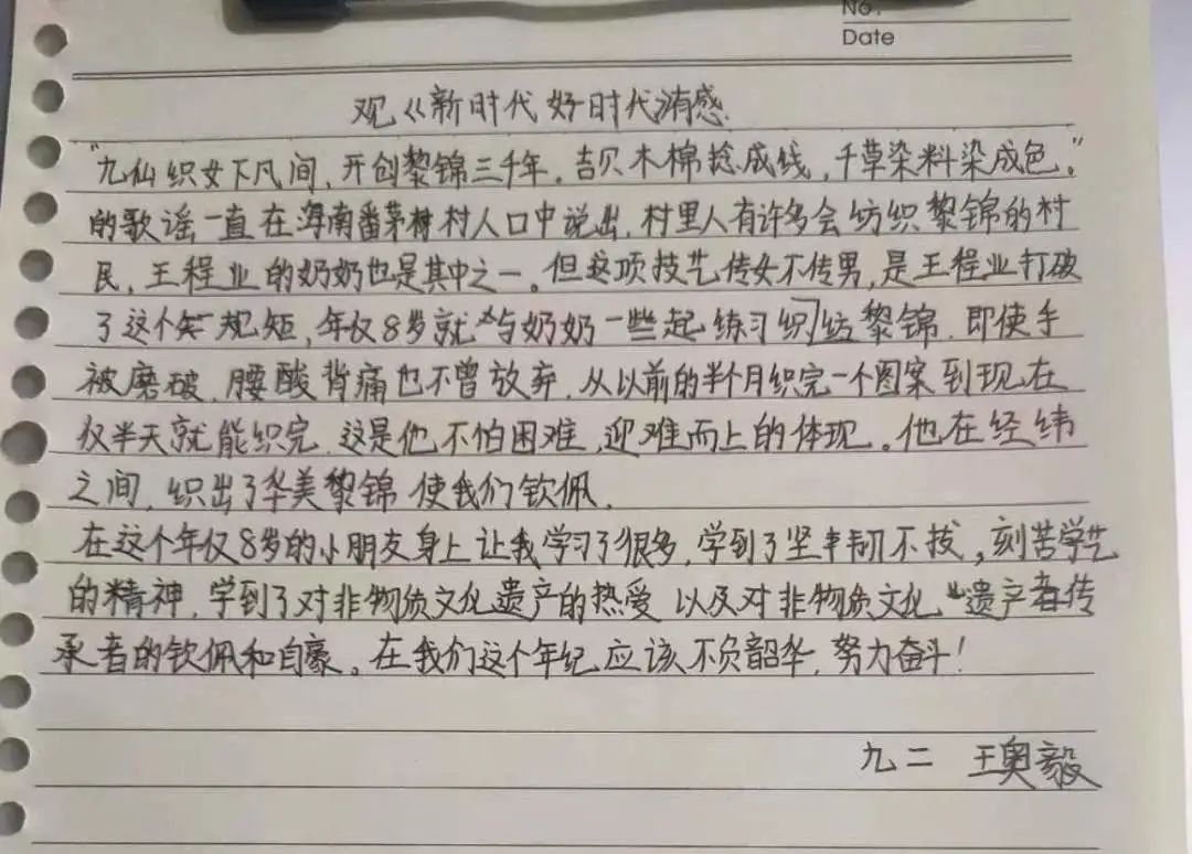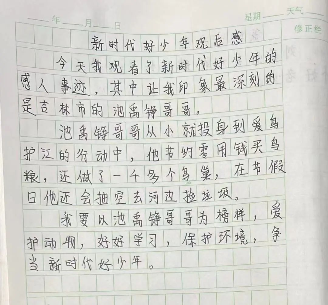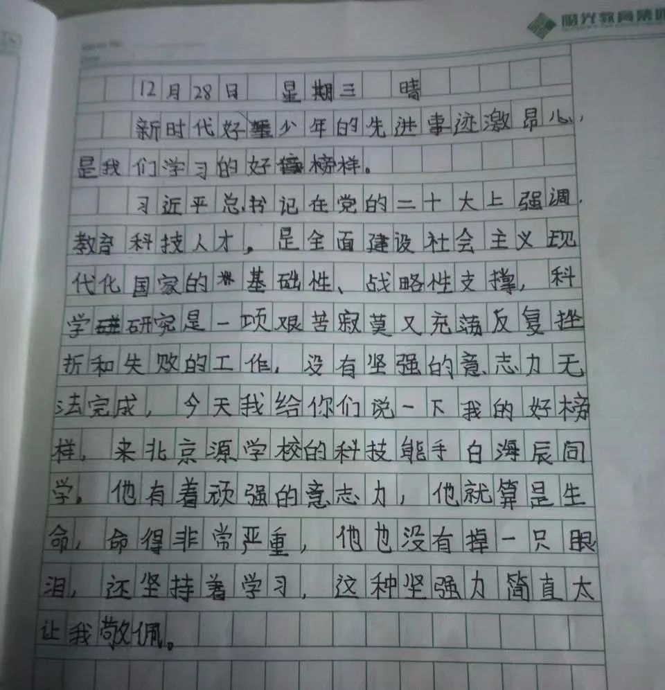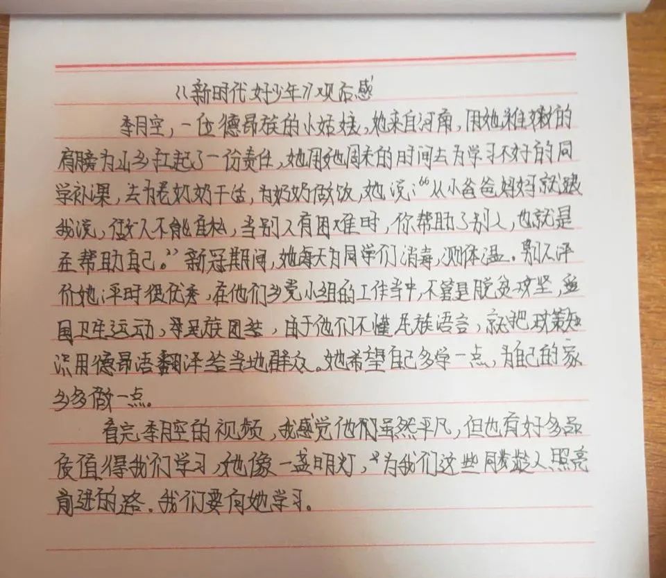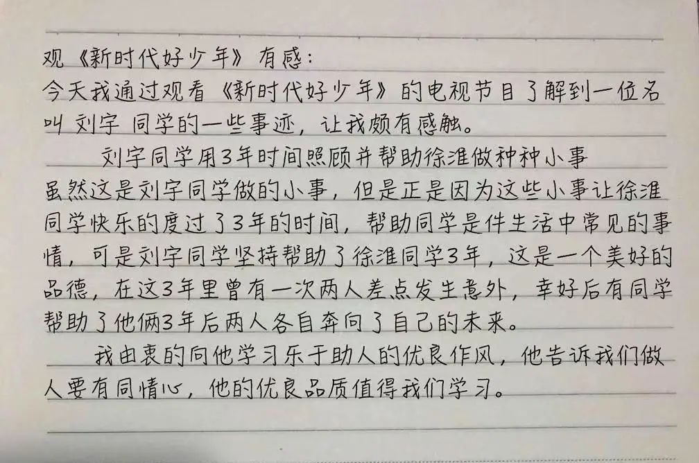 2022年12月27日,中央文明辦、教育部、共青團(tuán)中央、全國(guó)婦聯(lián)、中國(guó)關(guān)工委聯(lián)合舉辦2022年“新時(shí)代好少年”先進(jìn)事跡發(fā)布活動(dòng),向社會(huì)推出全國(guó)各地32名優(yōu)秀少年的感人事跡。 我校組織學(xué)生線上觀看新時(shí)代好少年先進(jìn)事跡發(fā)布活動(dòng),同學(xué)們?cè)谟^看后分別書(shū)寫(xiě)了自己的感受。 同學(xué)們觀看直播