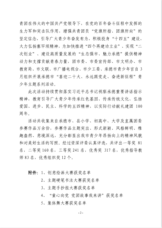 近日,承德市“喜迎二十大、永遠(yuǎn)跟黨走、奮進(jìn)新征程”青少年主題系列活動(dòng)評(píng)審結(jié)果揭曉,我校榮獲“優(yōu)秀組織獎(jiǎng)”,多人參賽作品獲獎(jiǎng),同時(shí),車曉鈺、劉冰老師榮獲“優(yōu)秀指導(dǎo)教師獎(jiǎng)”。