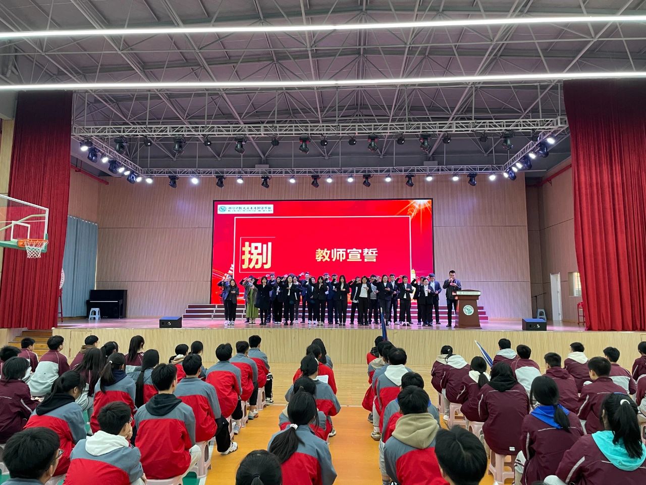 大會第八項:教師宣誓 中學(xué)教師集體宣誓: 再過一百天,同學(xué)們將帶著老師和父母的殷切期望,懷揣著夢想,踏進莊嚴的中考考場,去實現(xiàn)人生的美好理想,去書寫青春亮麗的華章。讓我們同心協(xié)力,奮斗一百天,讓飛翔的夢在六月張開翅膀;奮斗一百天,讓雄心與智慧在六月閃光!在此我們中學(xué)部全體教師鄭重宣誓: 忠于職守,精誠團結(jié);言傳身教,以身作則。 腳踏實地,刻苦鉆研;甘于奉獻,燃燒激情。 我們?yōu)槟銈儽q{護航,我們?yōu)槟銈儞u旗吶喊。 我們與你們同甘共苦,我們與你們風(fēng)雨同舟。 讓我們共同揮灑汗水,斗志昂揚,奮戰(zhàn)一百天。 讓我們一起傾注熱情,決戰(zhàn)中考,創(chuàng)造輝煌!