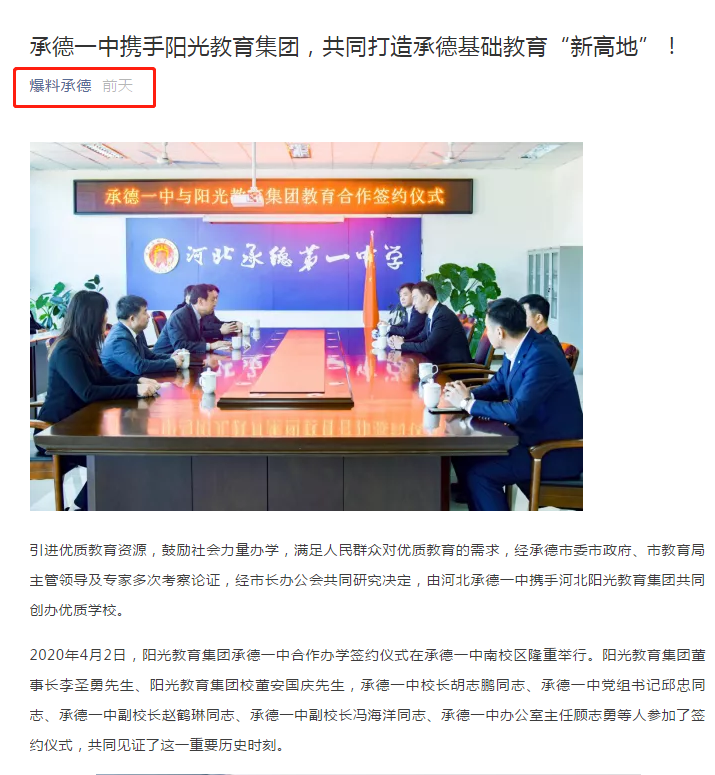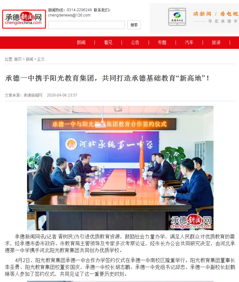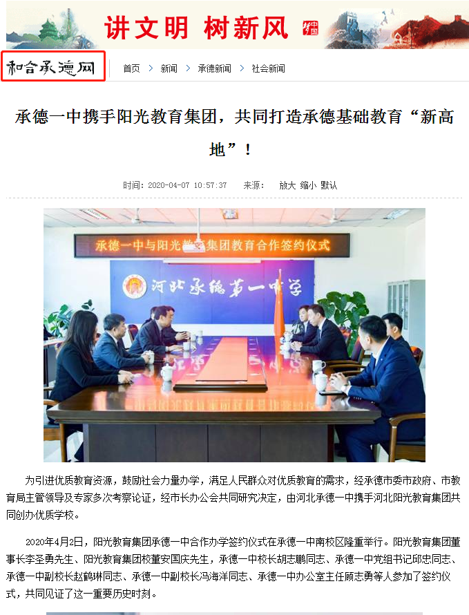 2020年4月2日,陽光教育集團&承德一中聯(lián)合辦學(xué)簽約儀式圓滿落幕。省會優(yōu)質(zhì)資源落戶承德,攜手河北承德第一中學(xué)共同打造高端優(yōu)質(zhì)基礎(chǔ)教育名校——承德陽光未來實驗學(xué)校。
