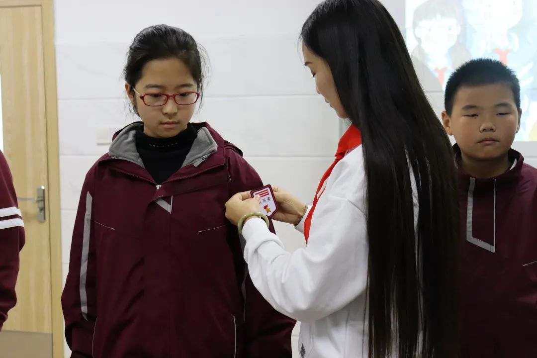 為大隊委員授予干部標志 李紅測老師為衛(wèi)生部頒發(fā)干部標志。