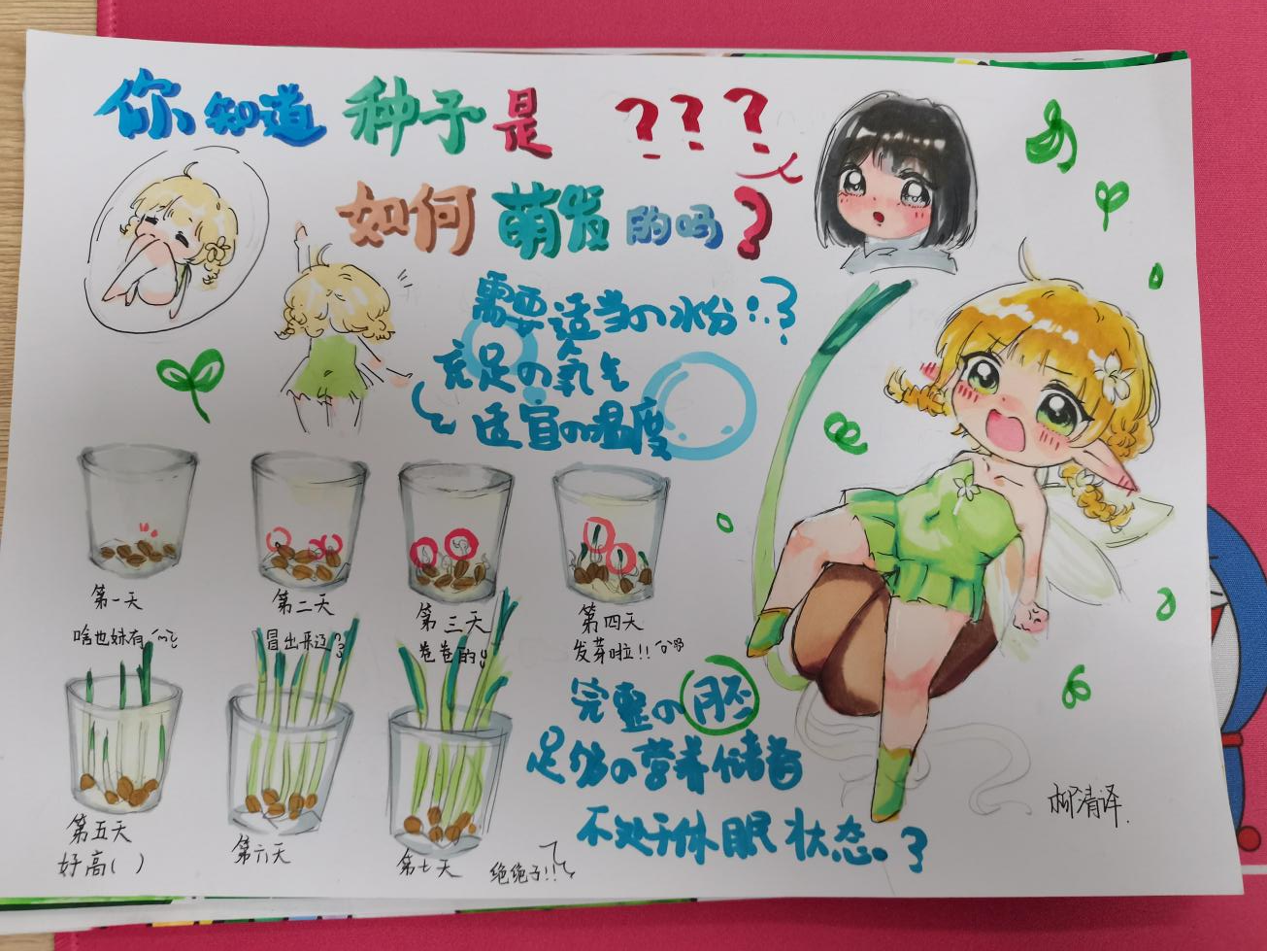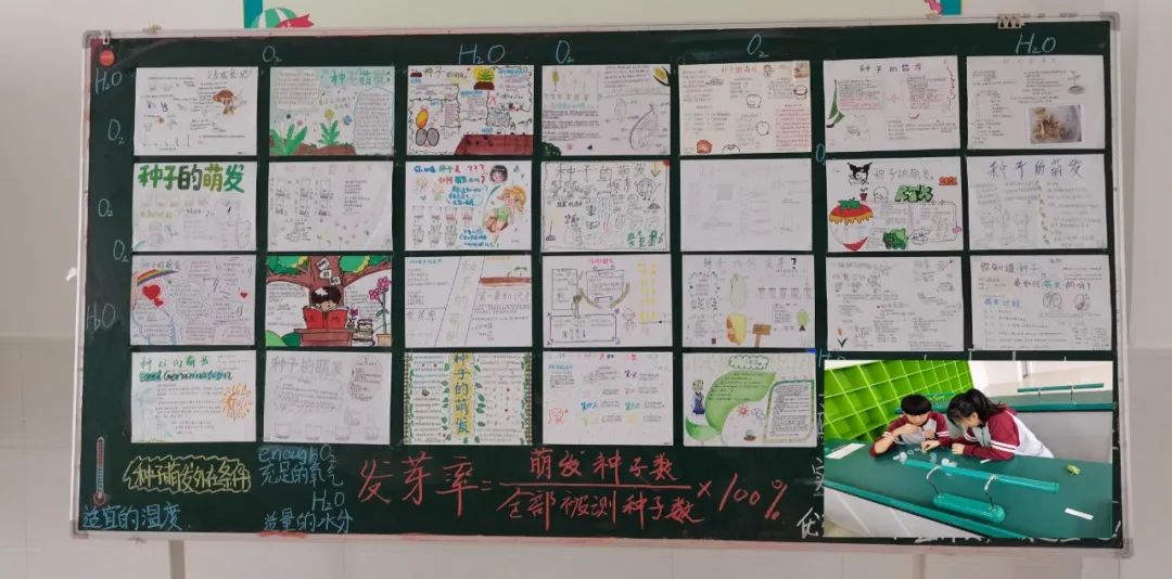 興趣是求知的開(kāi)始,是學(xué)習(xí)的動(dòng)力,只有當(dāng)孩子對(duì)所研究的活動(dòng)產(chǎn)生濃厚的興趣時(shí),他們才會(huì)積極地探索、仔細(xì)地觀察、認(rèn)真地思考。 知識(shí)小課堂 在種子萌發(fā)的過(guò)程中,胚根發(fā)育成植物體的根,胚芽發(fā)育成莖和葉兒,所以。胚是種子的主要部分,是新植物的幼體。 種子的萌發(fā)是綠色開(kāi)花植物生命周期的開(kāi)始。種子中不僅包含著一個(gè)新植物的幼體,而且能為種子的萌發(fā)提供營(yíng)養(yǎng)物質(zhì)。在條件適宜的情況下,種子就會(huì)萌發(fā),開(kāi)始植物的生活。 孩子們以手抄報(bào)的形式,圖文并茂地將自己的觀察過(guò)程記錄了下來(lái)。 【種子的萌發(fā)作品展】