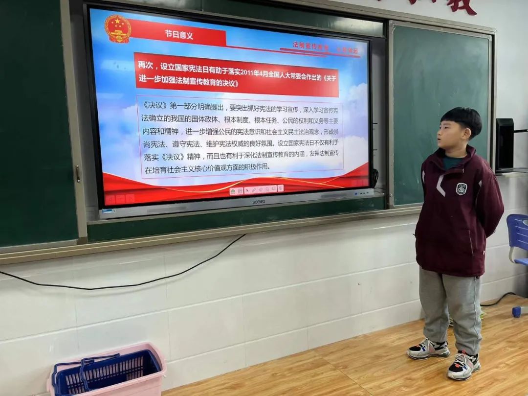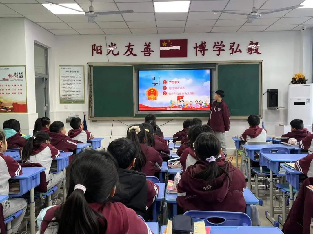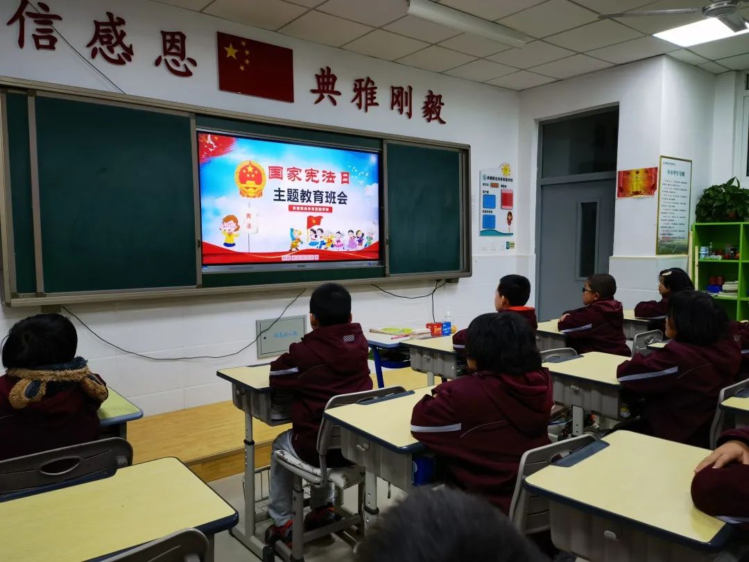 希望日后每一位同學(xué)都能自覺行動起來,積極主動的參與到豐富多彩的國家憲法日系列主題教育活動之中,爭做憲法小衛(wèi)士。 主題班會 小學(xué)部各班級還積極開展了以“國家憲法日”為主題的教育班會活動,教育學(xué)生學(xué)法知法守法,做一個遵紀(jì)守法的好公民。不斷增強(qiáng)青少年學(xué)生的法制觀念和遵紀(jì)守法意識,預(yù)防和減少違法犯罪行為。