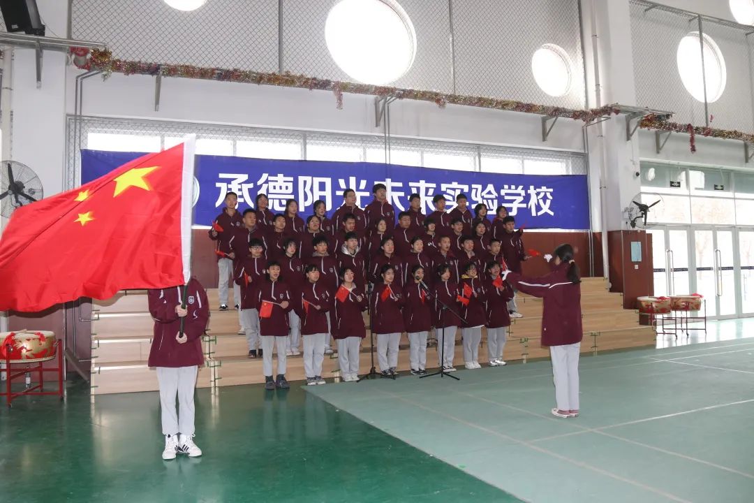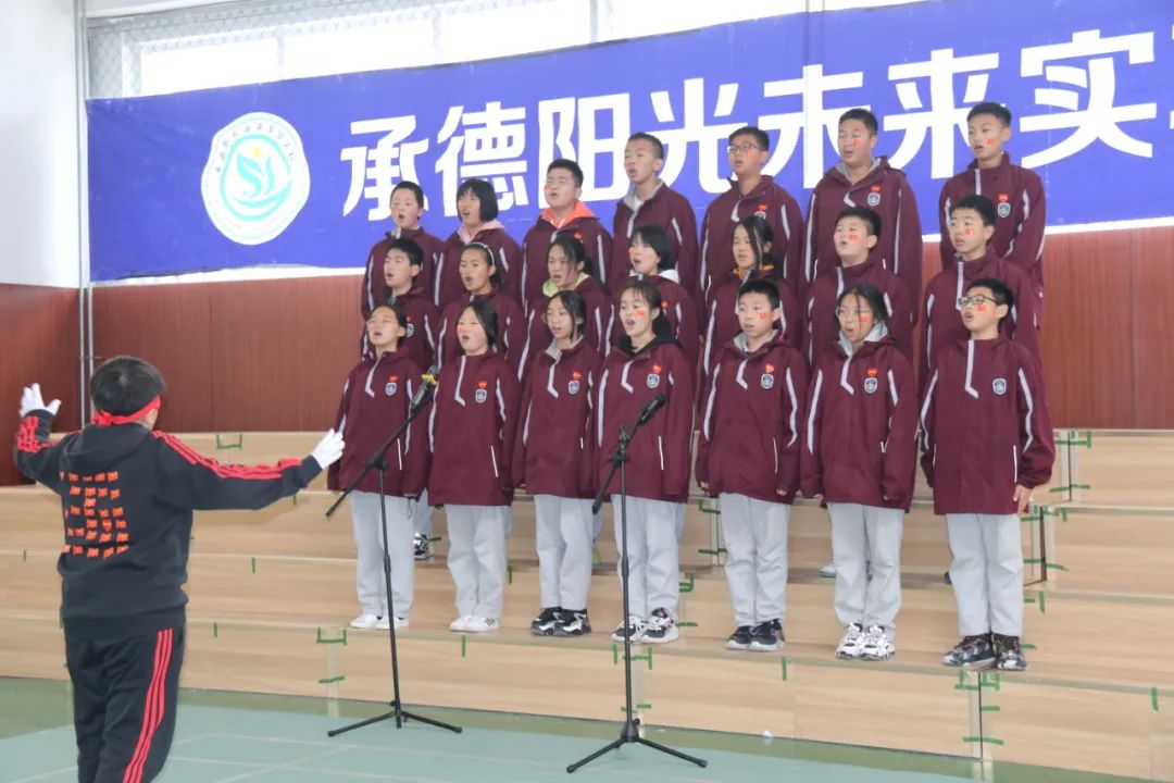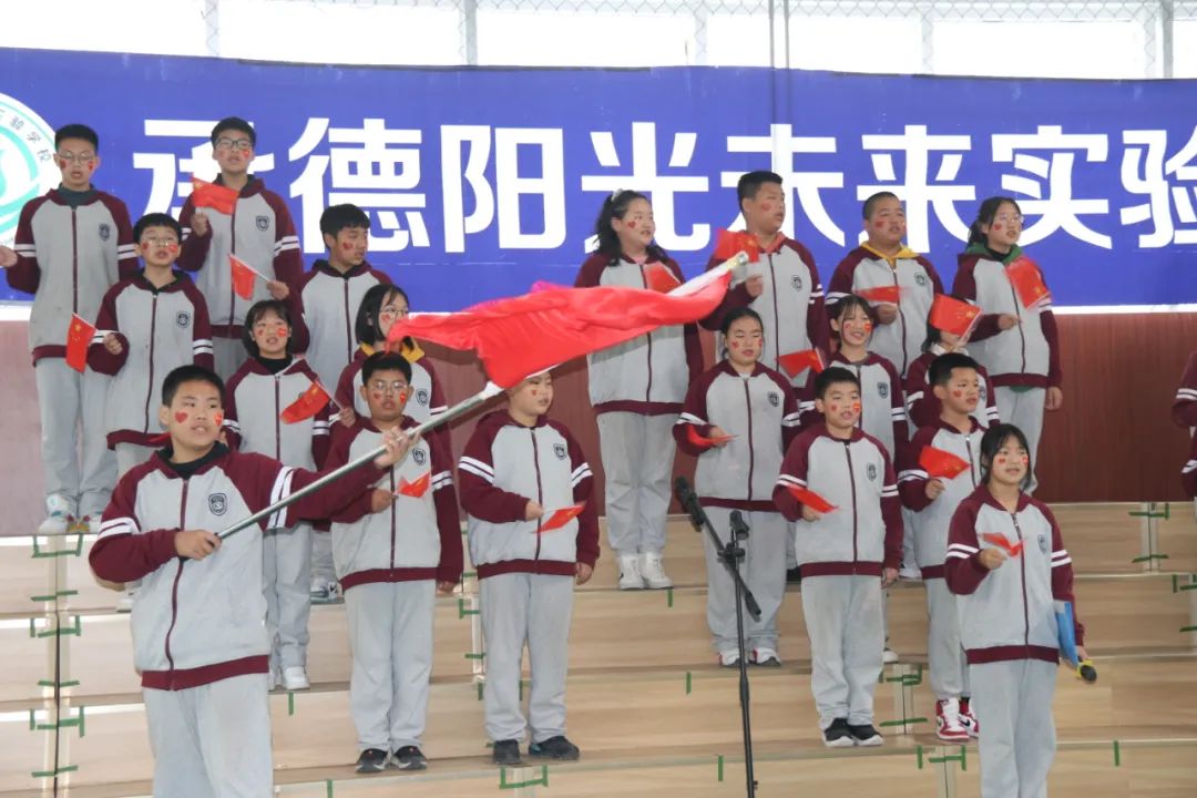 比賽最后,同學(xué)們高舉國(guó)旗,全場(chǎng)師生共同歡唱《歌唱祖國(guó)》祝愿?jìng)ゴ蟮淖鎳?guó)繁榮昌盛!