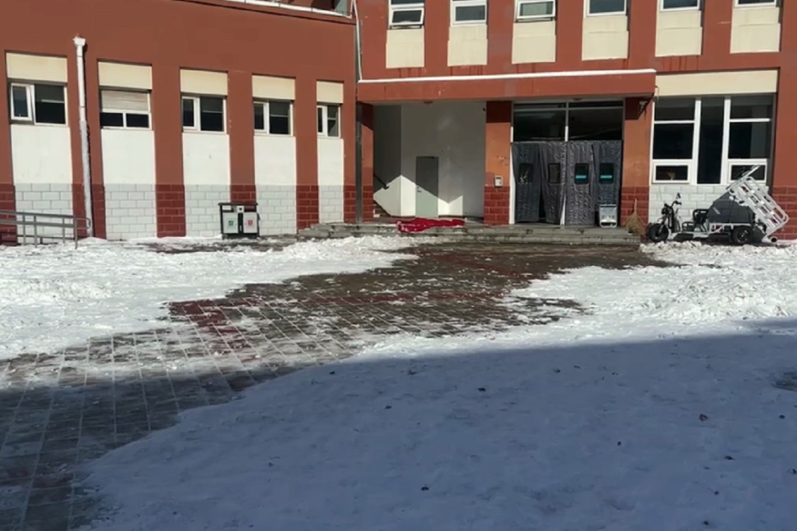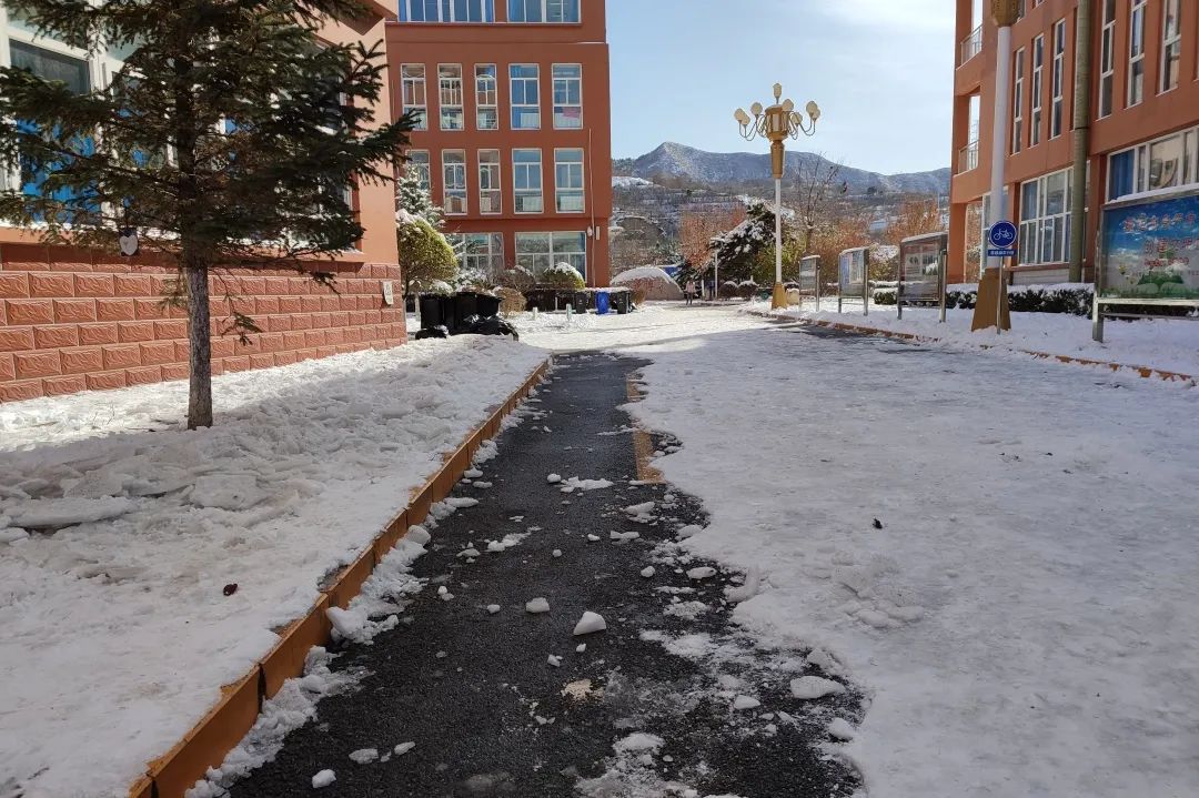 經(jīng)過一個多小時的奮戰(zhàn),教學樓門口、食堂門口、校園內(nèi)主干道路的積雪和冰層很快被清掃干凈,“鏟雪除冰”行動成效顯著。