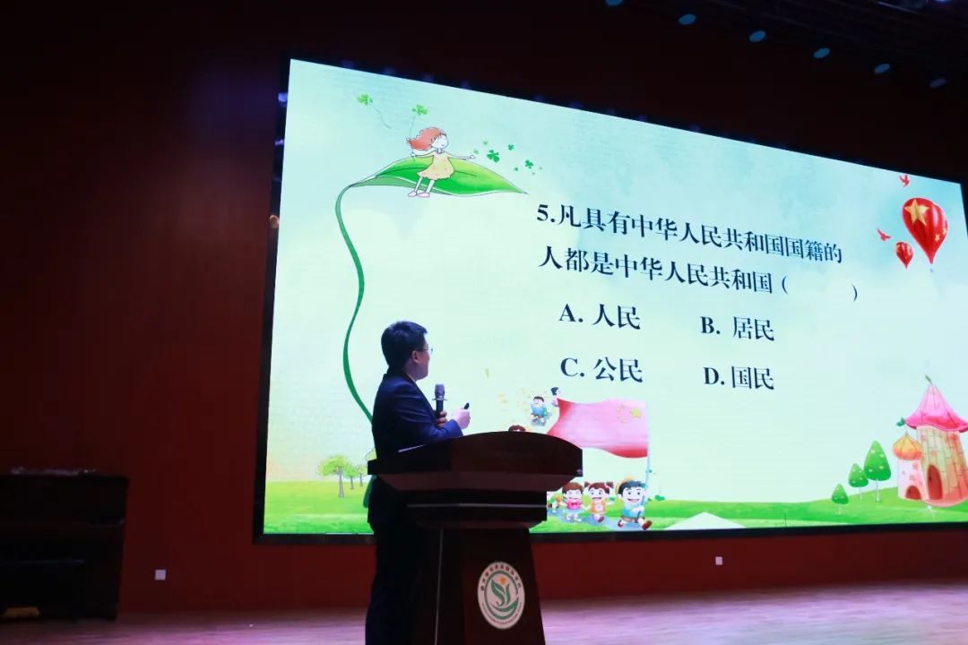 主講人為第一檢察部員額檢察官李波先生 主題宣講之前,李波檢察官就給大家提出了問題,詢問同學(xué)們是否檢察院的作用,同學(xué)們都發(fā)表了自己的看法,李檢察官通過一個非常生動有趣,且和生活息息相關(guān)的小視頻,帶同學(xué)們更深入的了解了檢察院的職責(zé)和作用。并且詢問了同學(xué)們知不知道國歌的名字,在我們國家最大的法律是什么法,同學(xué)們都給出了準(zhǔn)確的回答,國歌的名字是《義勇軍進行曲》,國家最大的法律是《憲法》。 送法進校園