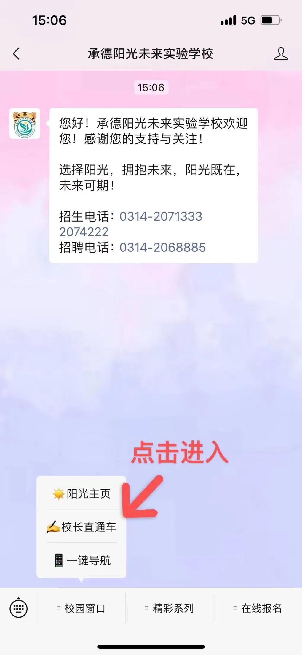 新學(xué)期,新氣象,為了加強(qiáng)學(xué)校與家長之間的溝通,我校微信公眾號特此增加了“校長直通車”通道,把提意見與建議的話筒交給學(xué)生、交給家長。 校長直通車入口如下: