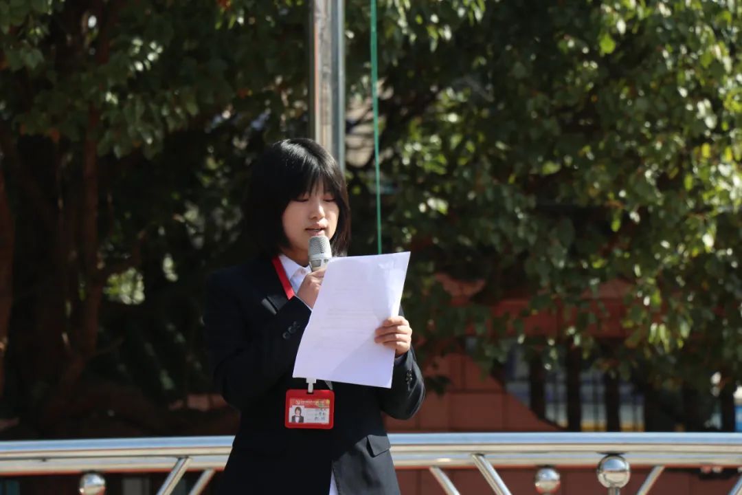 我校國(guó)旗護(hù)衛(wèi)隊(duì)排著整齊的隊(duì)列、邁著鏗鏘的步伐來(lái)到了旗桿前。伴著嘹亮的《義勇軍進(jìn)行曲》,五星紅旗冉冉升起。 國(guó)旗下講話