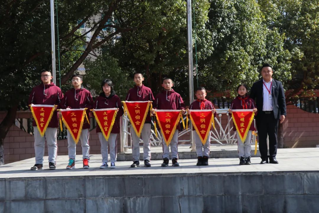 任明貴主任為文明宿舍頒獎(jiǎng)。 全體師生呼喊校訓(xùn)