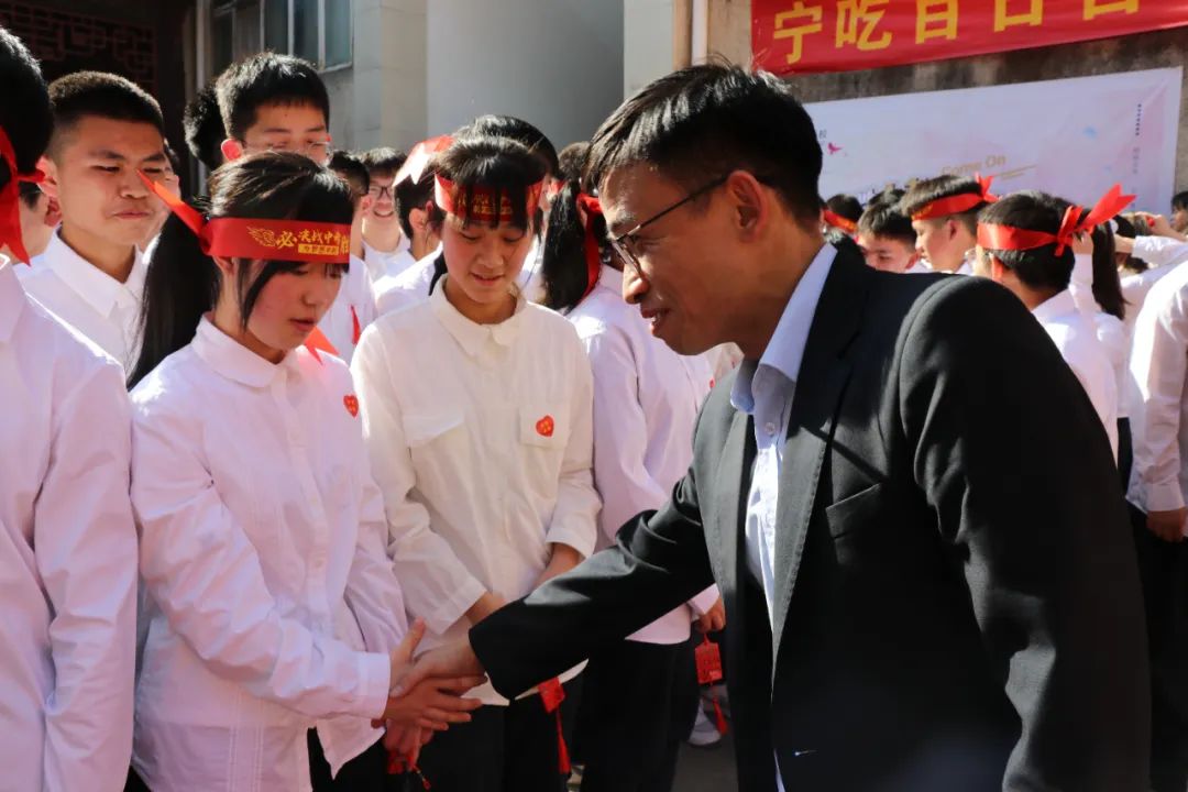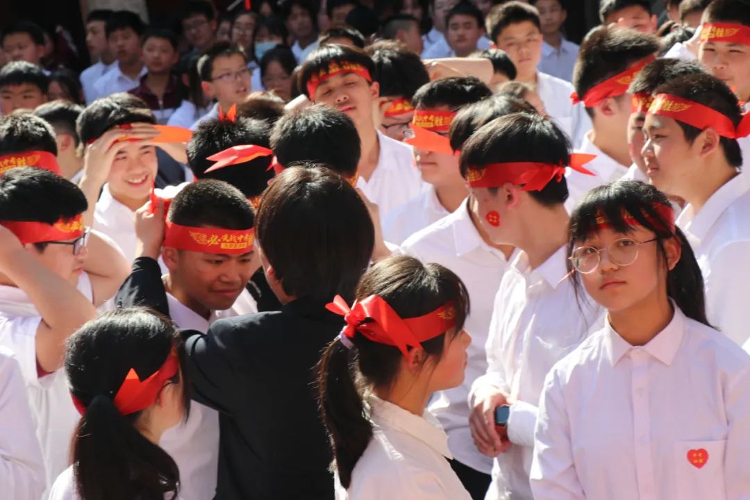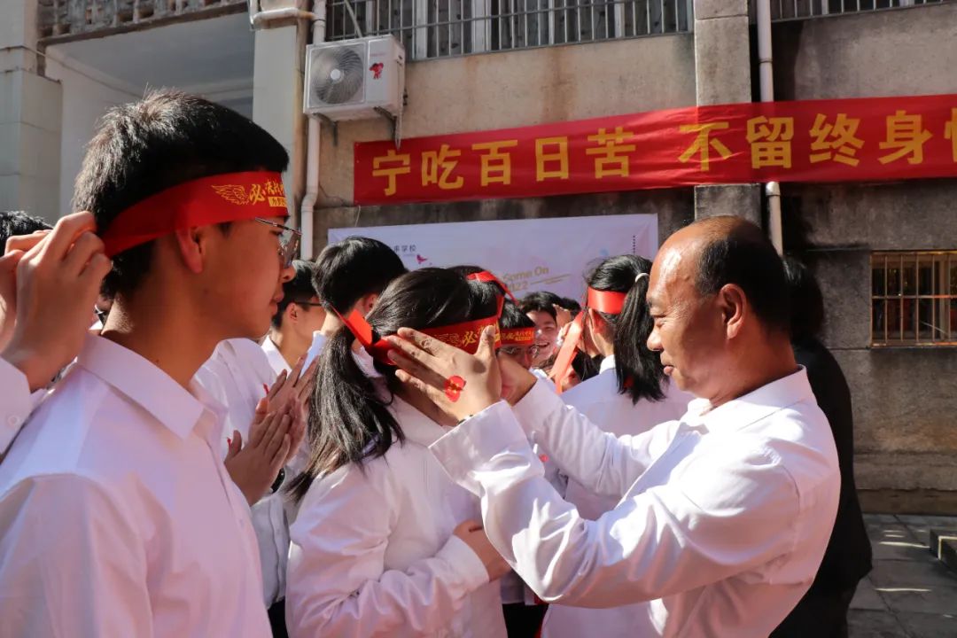 段海春校長、劉昌龍副校長及9年級任課老師們一一為學(xué)子們綁上寫有“必勝”的頭巾,送上自己最真摯的祝福。