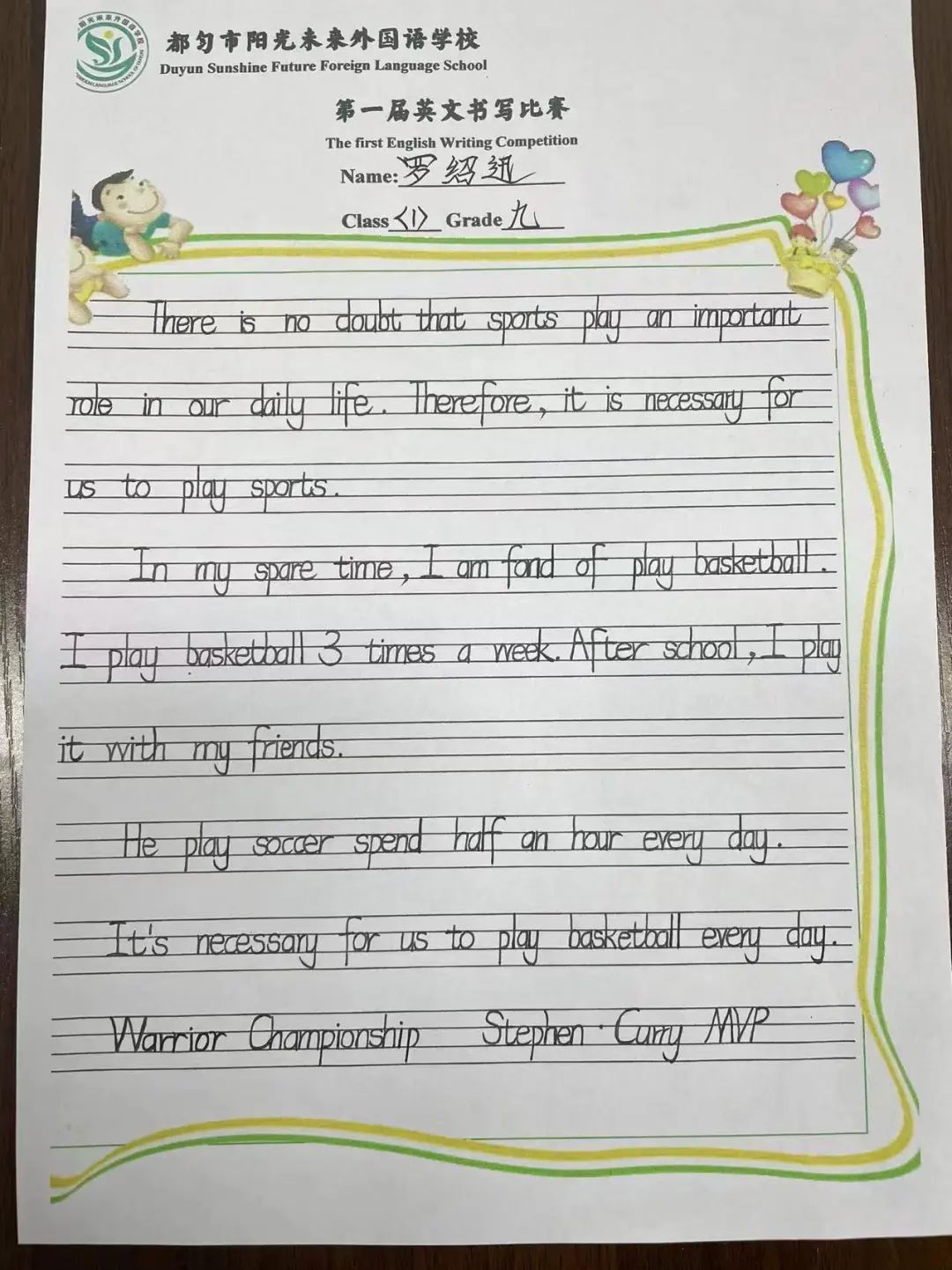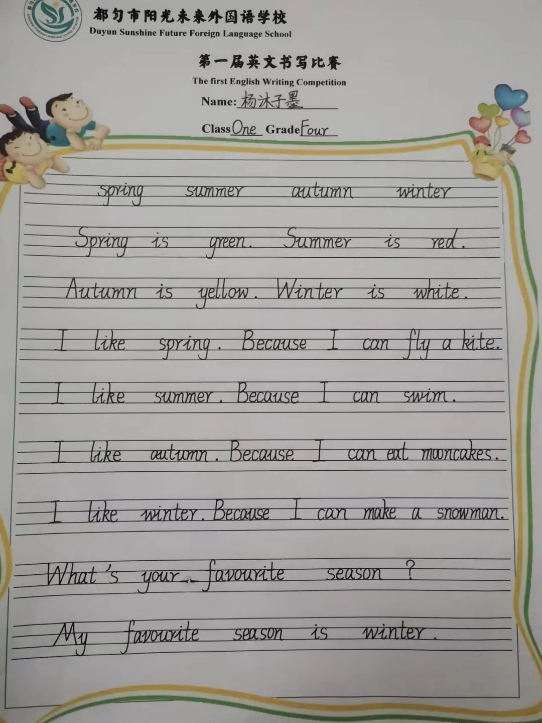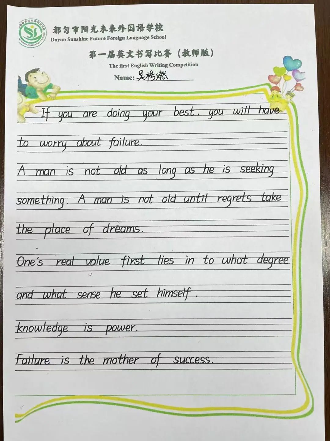 頒獎結(jié)束后,第一屆英文書寫暨英文歌唱比賽緩緩落幕!拓展語言的邊界就是拓展世界的邊界,英語是認(rèn)識世界的一種工具,它能讓我們走向詩和遠(yuǎn)方!此次活動為陽光學(xué)子搭建了用英語展現(xiàn)自我的舞臺,營造了濃厚的英語學(xué)習(xí)氛圍。學(xué)生們在活動中盡顯真我,邁出的每一步都為下一次出發(fā)積攢勇氣。下一次,他們能展示更棒的自己!