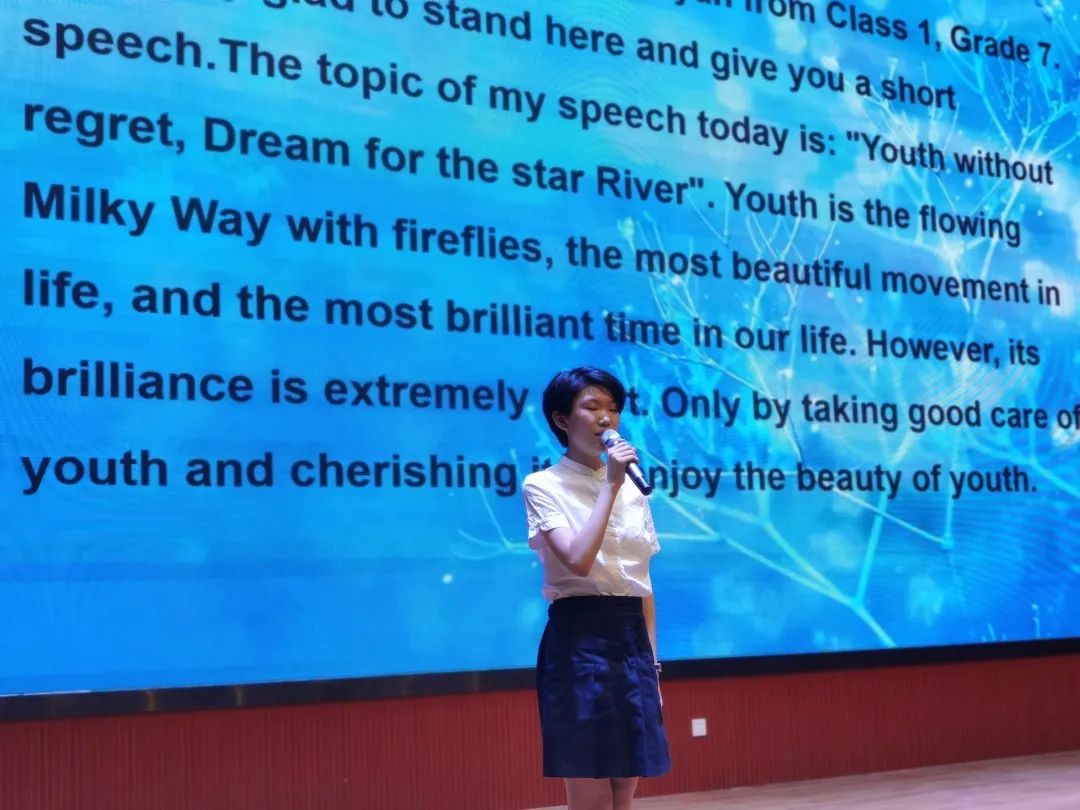 All the leaders, dear teachers and students: Good evening! I'm very happy to give the opening speech for everybody. Now you are watching the 1st session English speech contest in our school. This is the final of junior groups. Thank you for coming to this evening’s competition. Today, 21 students will take part in the contest. They are coming from different Classes of different Grades. I hope we can exchange experiences of how to learn English better. These experiences will be very useful for the students in our school. So I hope we'll all make good use of this opportunity. 尊敬的各位領導,親愛的老師、同學們:大家晚上好! 非常榮幸為本屆英語演講比賽致開幕詞!這是我們學校初中部第一屆英語演講比賽,感謝各位選手和指導老師的精心準備。今天,21位選手將參加比賽,他們來自不同年級,不同班級,通過這次比賽,我希望同學們可以更好地交流關于英語學習的經(jīng)驗,這些寶貴的經(jīng)驗將會助大家一臂之力!希望大家珍惜這次機會,一起體驗英語語言的魅力! 整場比賽設計精巧、環(huán)節(jié)緊湊。既有腹有詩書氣自華的選手們帶來的英語饕餮盛宴,各位參賽的同學們才藻艷逸意氣風發(fā),自信大方的舞臺風采,流利標準的口語表達,給大家留下了深刻的印象,現(xiàn)場掌聲不斷。 1、七年級一班 宮佳彤