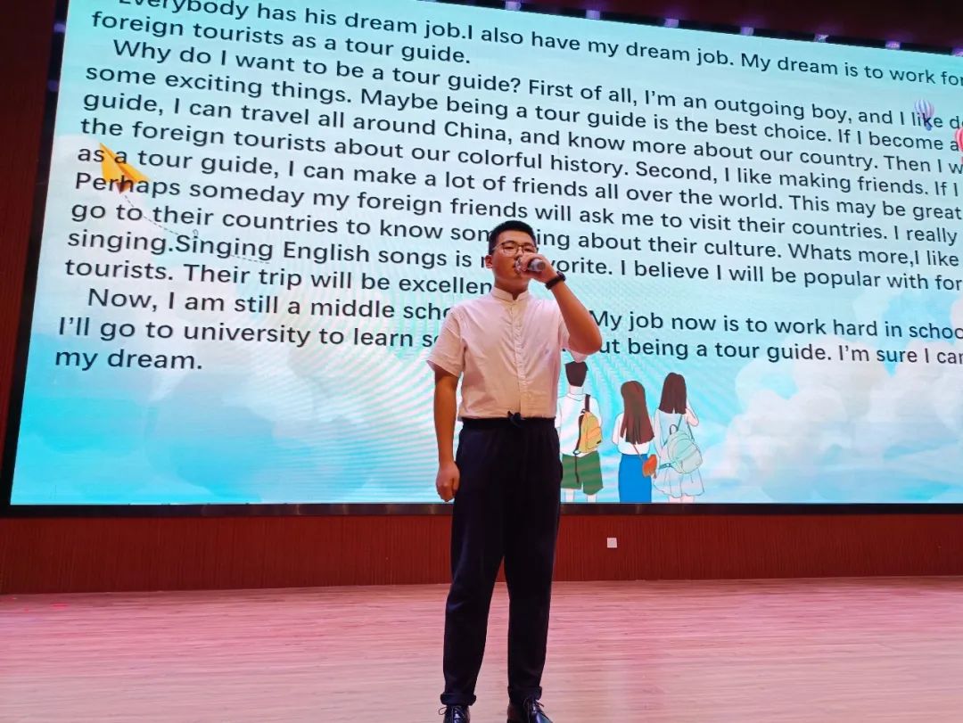 21名決賽選手依次上臺演講,形式多樣,他們時而慷慨激昂,時而低回婉轉(zhuǎn),時而歡快,時而凝重,標準流利的口語,繪聲繪色的表演,用英語流利的講述自己的夢想,為夢想而需要做出的努力,舉手投足間盡顯初中學子們的風采。