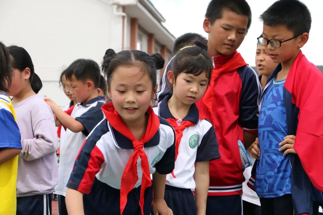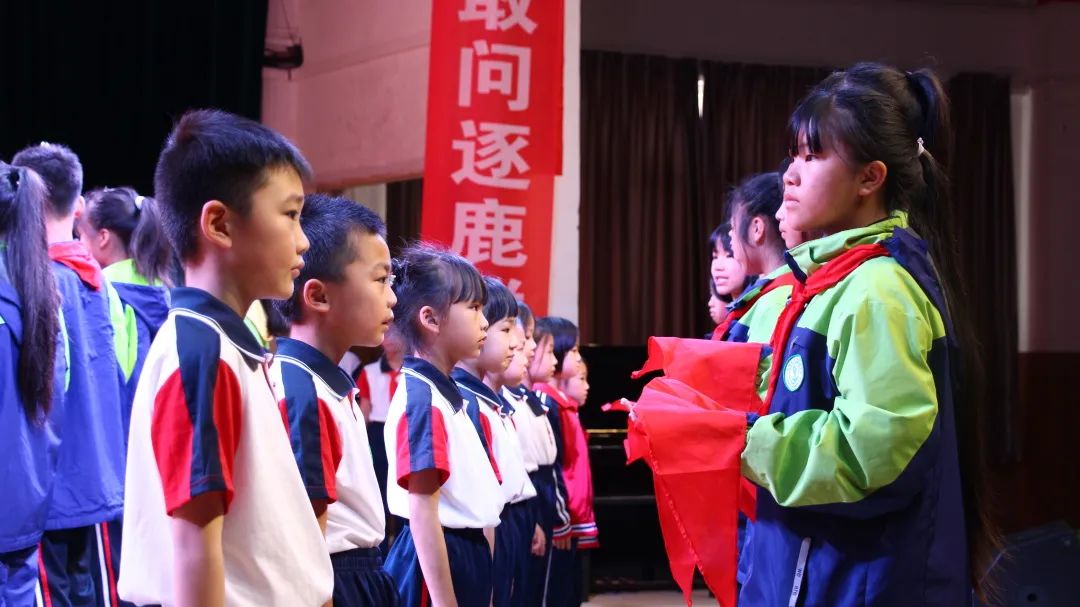 學(xué)生代表發(fā)言,稚嫩的聲音表達(dá)著對(duì)少先隊(duì)的憧憬,表示會(huì)以老隊(duì)員為榜樣,用自己的實(shí)際行動(dòng)為紅領(lǐng)巾增光添彩。 '六年級(jí)的哥哥姐姐為新隊(duì)員佩戴紅領(lǐng)巾 '