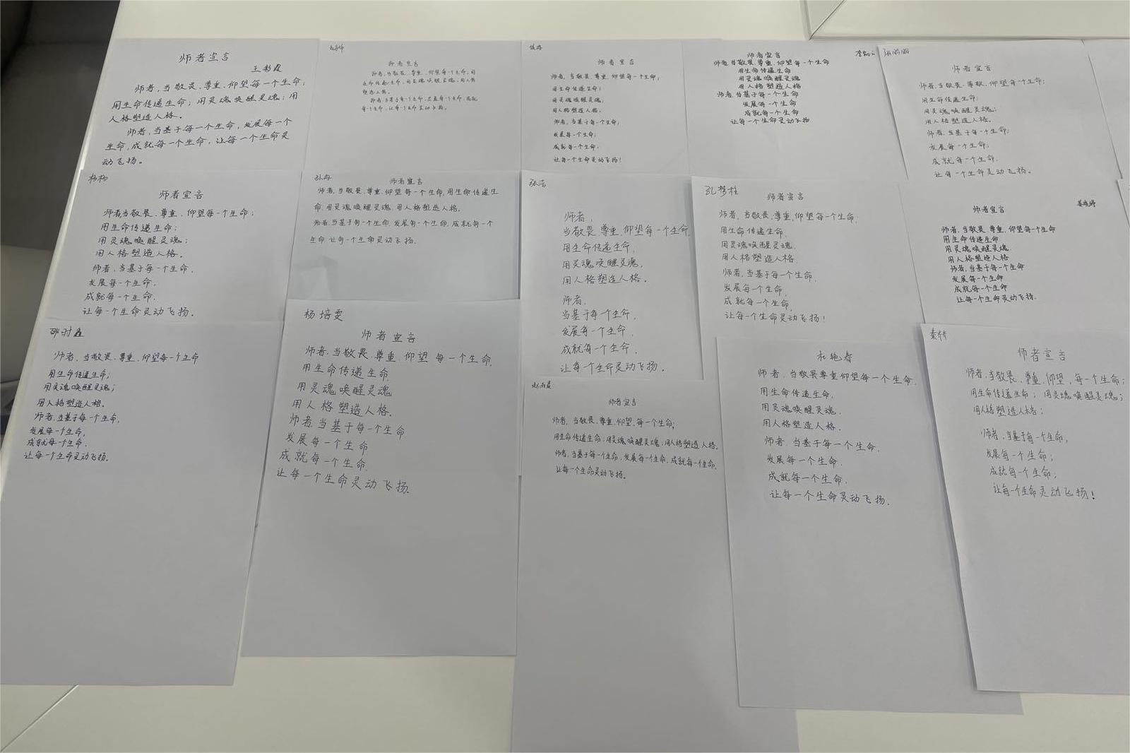 本次活動由初中部藝體組長楊杰老師主持 抽簽決定順序 本次活動分為演講《我的育人故事》、書法展示、即興問答、才藝展示四個環(huán)節(jié),抽簽決定老師們的順序。 我的育人故事 成長總是充滿著各種機遇,每一位班主任都分享了一個精彩的故事,每一個故事背后都有一段動人的旋律,每一個旋律的譜寫都是一點一滴的付出,感人的事跡還有很多,教育的故事還有很長,充滿愛的旅程永遠在繼續(xù)。 各位班主任老師創(chuàng)設(shè)積極向上的班級文化、精神文化,用潤物細(xì)無聲的愛滋潤著每一位學(xué)生的成長,對孩子的點滴付出成就了孩子,也成就了自己。她們始終堅持自己的教育夢,做孩子們最堅強的后盾。 書法展示 硬筆書法是中國特有的傳統(tǒng)文化,是用特有性能的書寫工具所寫出的一種線條造型藝術(shù)。選手老師們的一幅幅優(yōu)秀的書法作品令人賞心悅目,就請大家先睹為快吧……