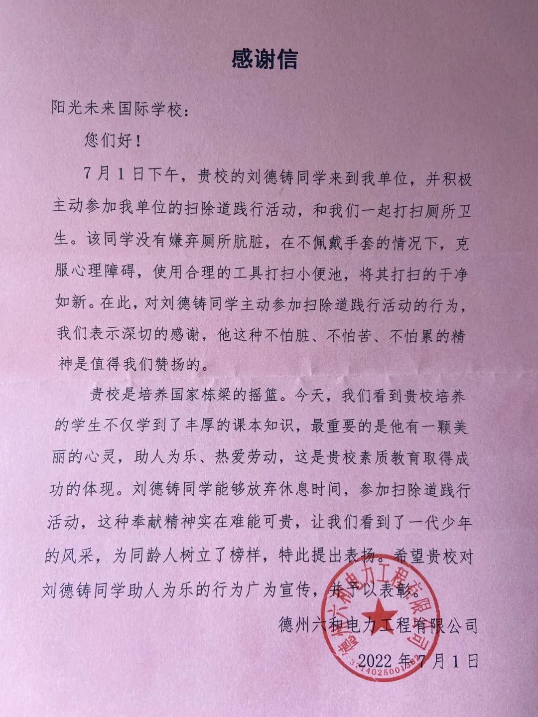 劉德鑄,男,就讀于德州陽光未來外國語學(xué)校二年級,自入學(xué)以來一直品學(xué)兼優(yōu)、多才多藝、能力突出,一直擔(dān)任小隊長、宿舍長、小組長、櫥柜管理員、黑板管理員等多重職務(wù)。他愛好廣泛,品學(xué)兼優(yōu),尊敬師長,團結(jié)同學(xué),做事踏實,有毅力,責(zé)任心強,學(xué)習(xí)刻苦,成績優(yōu)秀,待人有禮貌,以身作則,是一個德、智、體、美、勞全面發(fā)展的好學(xué)生。 一封感謝信 德州六和電力工程有限公司為我校二年級二班劉德鑄同學(xué)送來一封感謝信,表揚劉德鑄同學(xué)利用假期時間做義工。