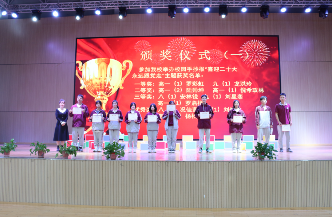 Δ校園手抄報(bào)“喜迎二十大 ·永遠(yuǎn)跟黨走” 一等獎 高一(1)班羅彩虹 、九(1)班龍洪玲 二等獎 高一(2)班陸帥坤、高一(1)班倪希政林 三等獎 八(1)班安林銳、九(1)班劉星戀 、高一(1)班羅啟杭 優(yōu)秀獎 八(1)班況佳瑩 、 八(1)班劉炆欣、高一(1)班楊松明