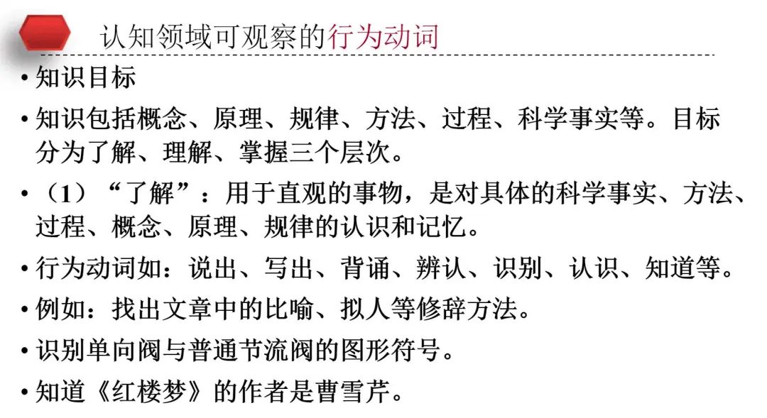 金穎主任細(xì)致的總結(jié)出認(rèn)知領(lǐng)域可觀察的行為動(dòng)詞并舉例說(shuō)明,帶領(lǐng)老師更加精細(xì)的將教學(xué)目標(biāo)進(jìn)行拆解重組并優(yōu)化。